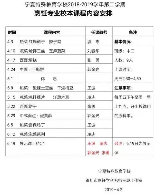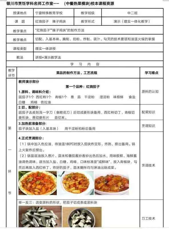 为进一步贯彻落实自治区教育厅办公室关于印发《自治区中等职业学校对口结对帮扶工作实施方案通知》的文件精神,促进宁夏特殊教育学校的跨越式发展,本着加强交流、共同提高,共建共享、均衡发展的原则,激励帮扶学校发挥辐射引领作用,产生良好的示范效应。银川职业技术学院餐旅服务专业部依照学院的安排部署,继续承担对宁夏特殊教育中等职业学校的结对帮扶工作。银川市烹饪学科名师工作室主持人王波老师,结合《银川市名师工作室实施方案》,携工作室成员开展了系列活动.