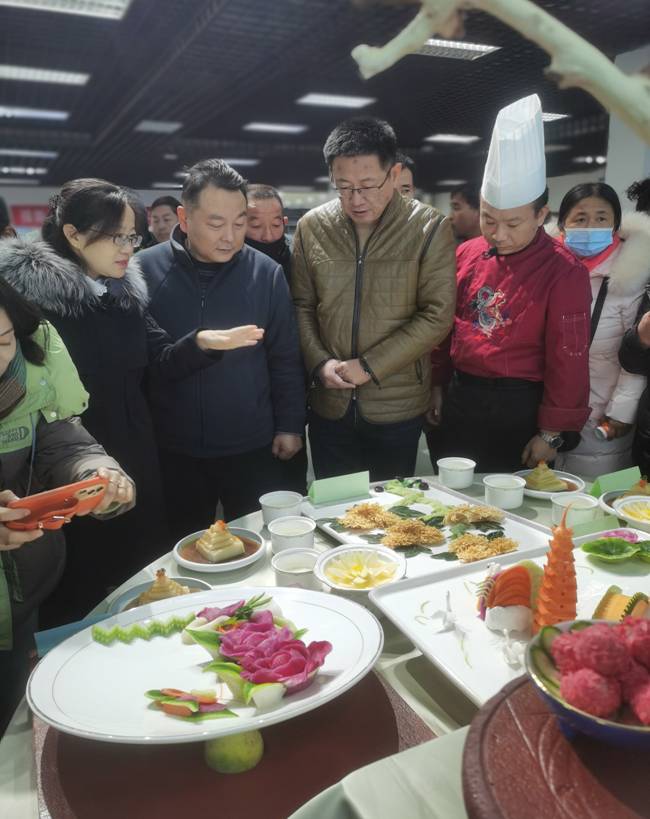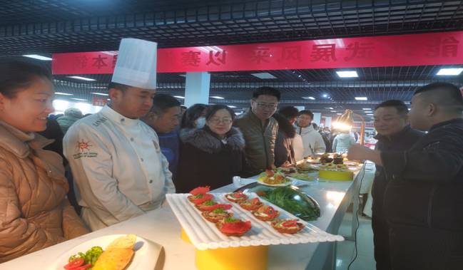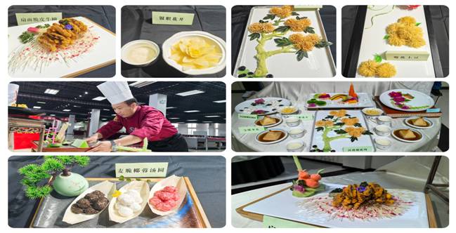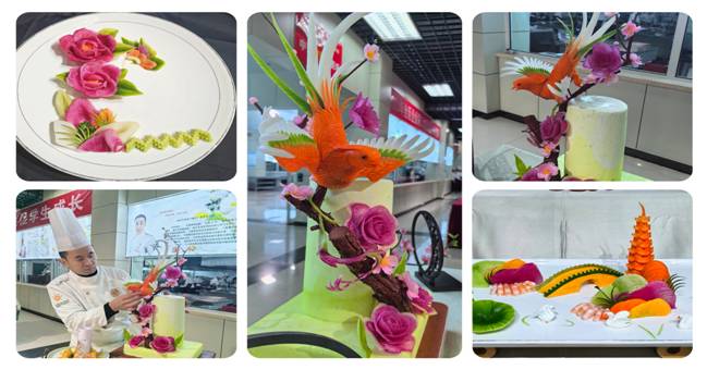 本次技能比赛,是为了进一步提升学生技能水平、培育工匠精神,促进专业建设和教学改革、提高教育教学质量,为2024年全区职业院校技能大赛挑选后备选手。根据学院党委的统一部署教务处关于开展系部学生技能竞赛的通知精神,餐旅服务部开展了师生同台技能展示比赛,张文主任召开了全体动员会议,传达学院的工作安排亲自督导,成立了技能竞赛领导小组,全体专业教师按工作计划如期开展,经过11月15——12月20日大赛覆盖全体学生专业部选拔、12月22日上午的决赛和比赛成果展示三个阶段进行。经过2个小时的比赛,由刘凯、杨明、赵志超、凌志四位老师组成的中餐热菜、雕刻与冷拼团队教师与学生的作品呈现展台。主题“前程似锦”的展台上,王波副主任用果蔬雕刻的锦鸡和牡丹花栩栩如生,造型与意境紧扣主题;杨明老师用白菜雕刻的花朵,搭配上鲜美的汤汁,呈现出色香味型俱佳的“银职开花”菜品,由凌志老师拼摆的冷拼作品,用立体手法,雕刻和拼摆出一副湖光山色的“锦绣江山”拼盘;刘凯老师用鸡脯肉制茸后,加入配料塑造成菊花造型,取名为“富贵菊花鸡”;赵志超老师用冬瓜经过刀工处理,熟制定型后制作的“宝塔冬瓜”;展台上还有老师们制作的“芝麻香辣牛肉”“银丝秋耳”“脆皮胭脂山药”“麦脆椰蓉汤圆”“菊花土豆”等。