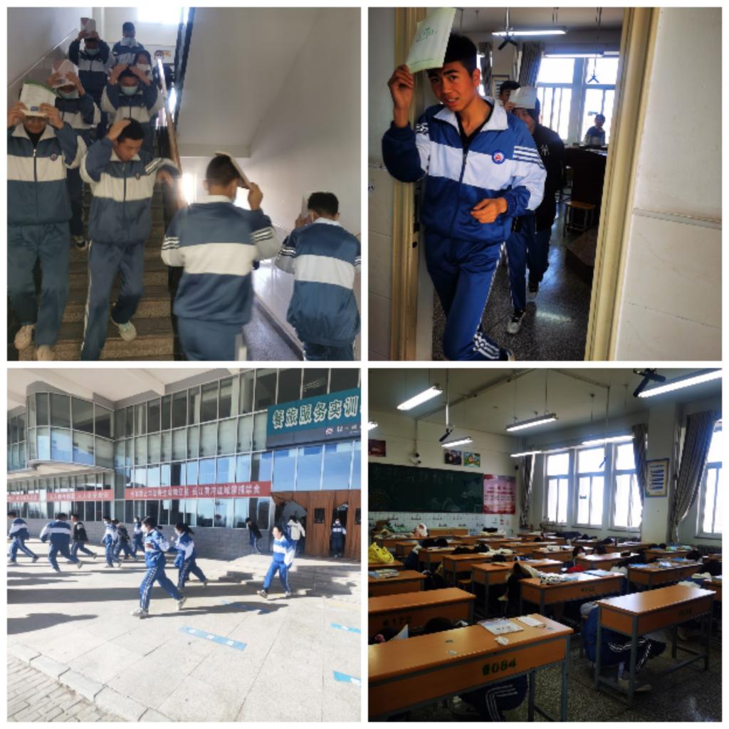 上午10点50分,随着哨音响起,教室区域防震演练正式开始。师生优先选择课桌下方进行紧急避险,随后各班课任教师迅速组织学生撤离。撤离过程中,同学们或双手护头,或用书本及其他物件保护头部,在教师的带领下快速、有序地按照疏散路线撤离到俭德广场集合清点人数,向德育主任杨晶进行汇报。