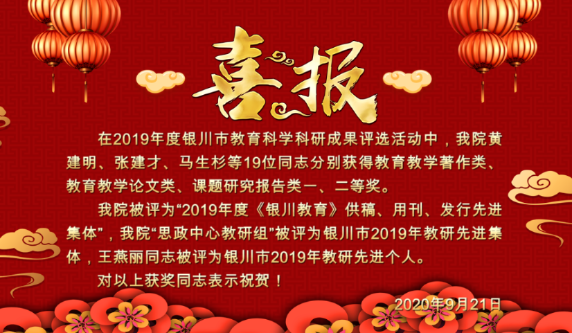 2020年9月18日,学院黄建明院长带领教学管理人员及骨干教师参加了在银川二中举办的“2020年全市教研工作会议”。会上隆重宣布了获得教研先进的学校、集体及个人,学院及多位教师获得多项奖项。学院被评为“2019年度《银川教育》供稿、用刊、发行先进集体”,学院思政中心教研组被评为“2019年银川市教研先进集体”,王燕丽老师被评为“2019年银川市教研先进个人”,黄建明、张建才等19位老师,在2019年教育科学科研成果评选活动中,分别获得一、二等奖。学院教研成果的获得,离不开学院提供的平台,营造的良好教研氛围,更离不开老师们的认真钻研、不断努力。