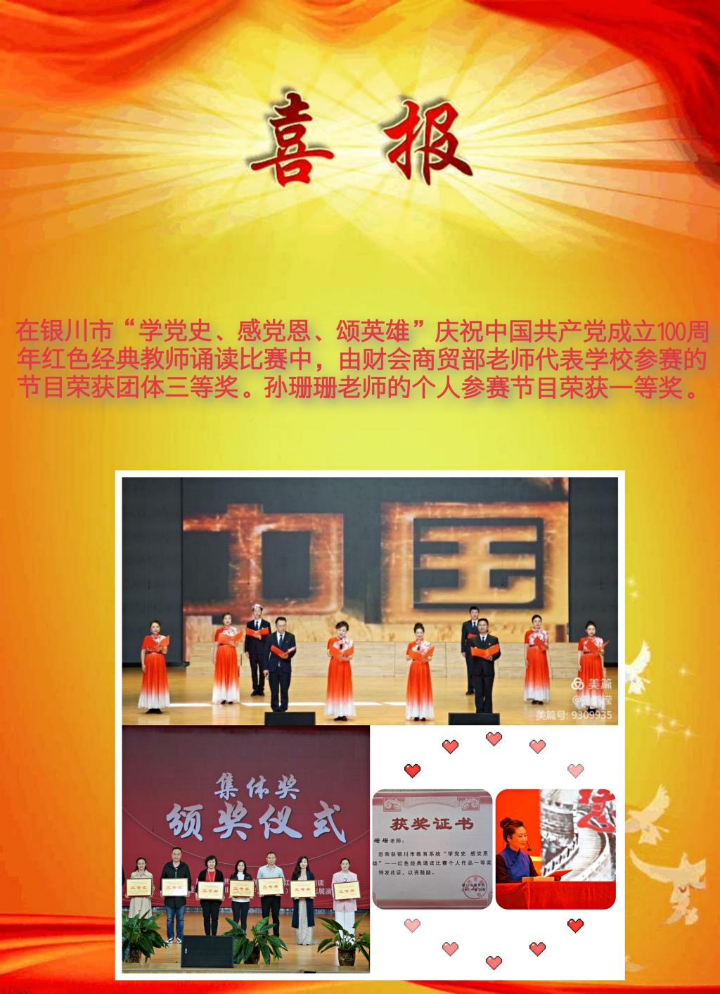 银川市“学党史、感党恩、颂英雄”庆祝中国共产党成立100周年红色经典教师朗诵比赛喜报