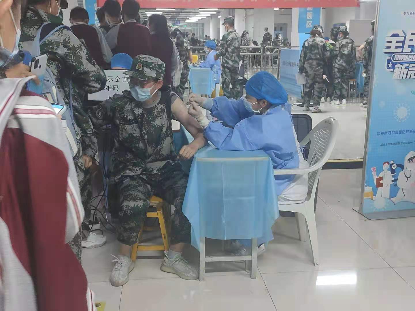不过一会儿,便到达了疫苗接种点,同学们在教官、主任的妥善安排下有序的就地休息,补充所需的物品。片刻休息之后,21级的新生同学率先进入主接种地进行疫苗第二针的注射。20级19级的同学们怀着忐忑的心情等待接种疫苗。