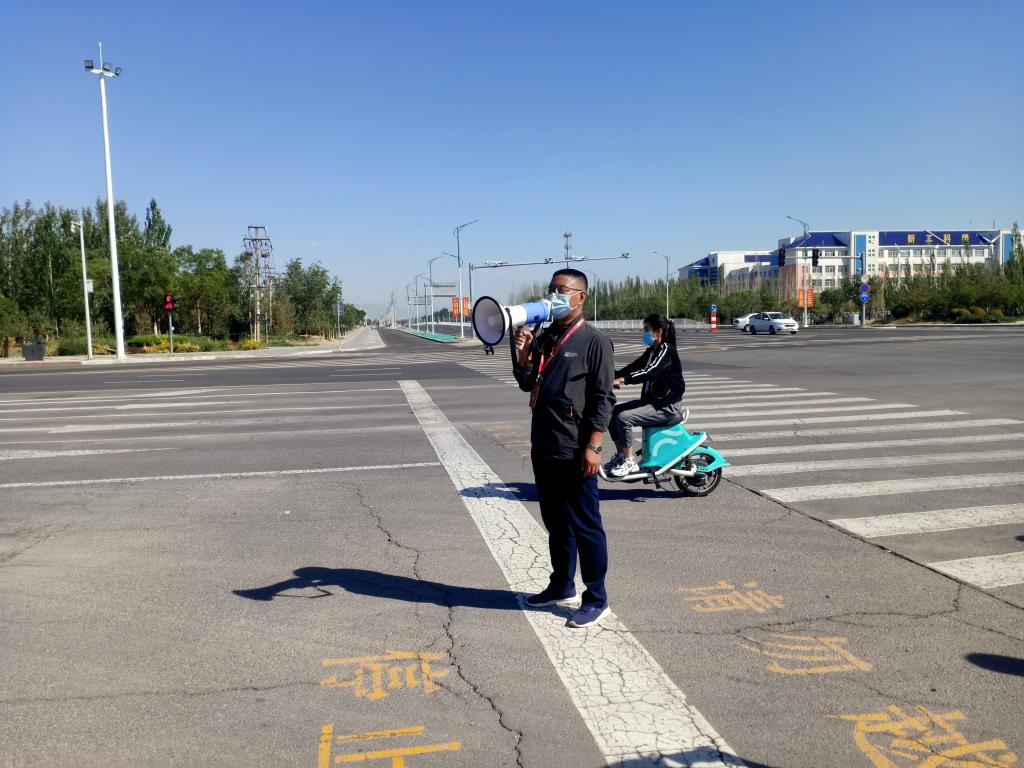 同学们排着长长的队伍,宛若游龙般整齐地走在马路上。很快便抵达了第一个红绿灯路口。系主任拿着喇叭一遍遍叮嘱过路的学生,年轻的教官以挺拔的身姿挡住来往的车辆确保学生们安全且有序的过马路。学生们一波一波的似来去的浪潮保持着整齐的队列走过这似远非近的路途。