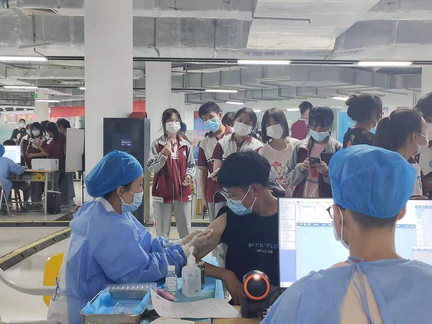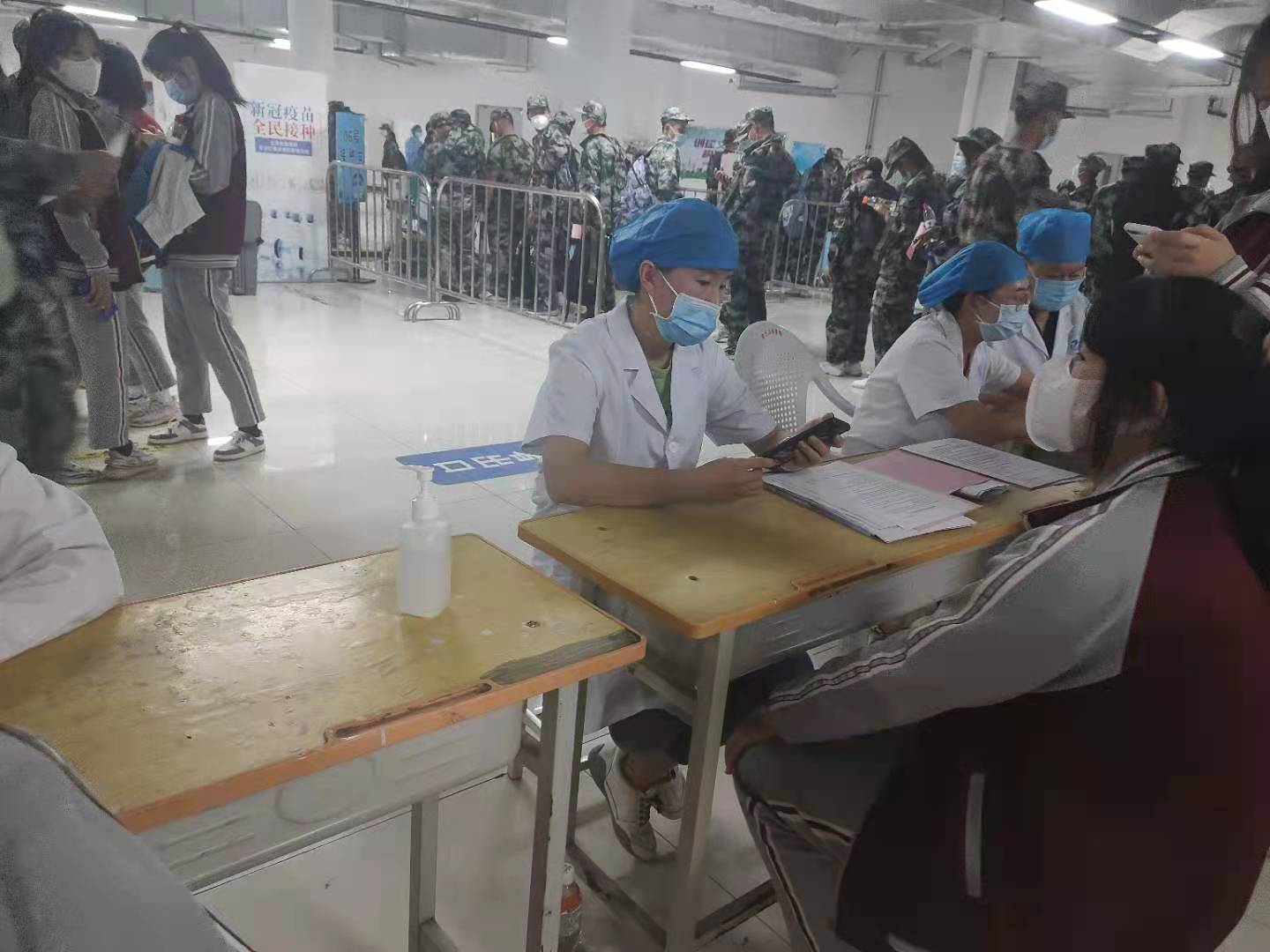 进入接种点,在等候区,同学们佩戴口罩保持一米的距离通过测温通道,排队等候接种。接种医护团队严格按照操作流程,严格把关、认真核对,准确录入接种人员信息并对同学们进行疫苗接种。同学们神情严肃紧张,认真对待这一次严肃又神圣的疫苗接种时刻。