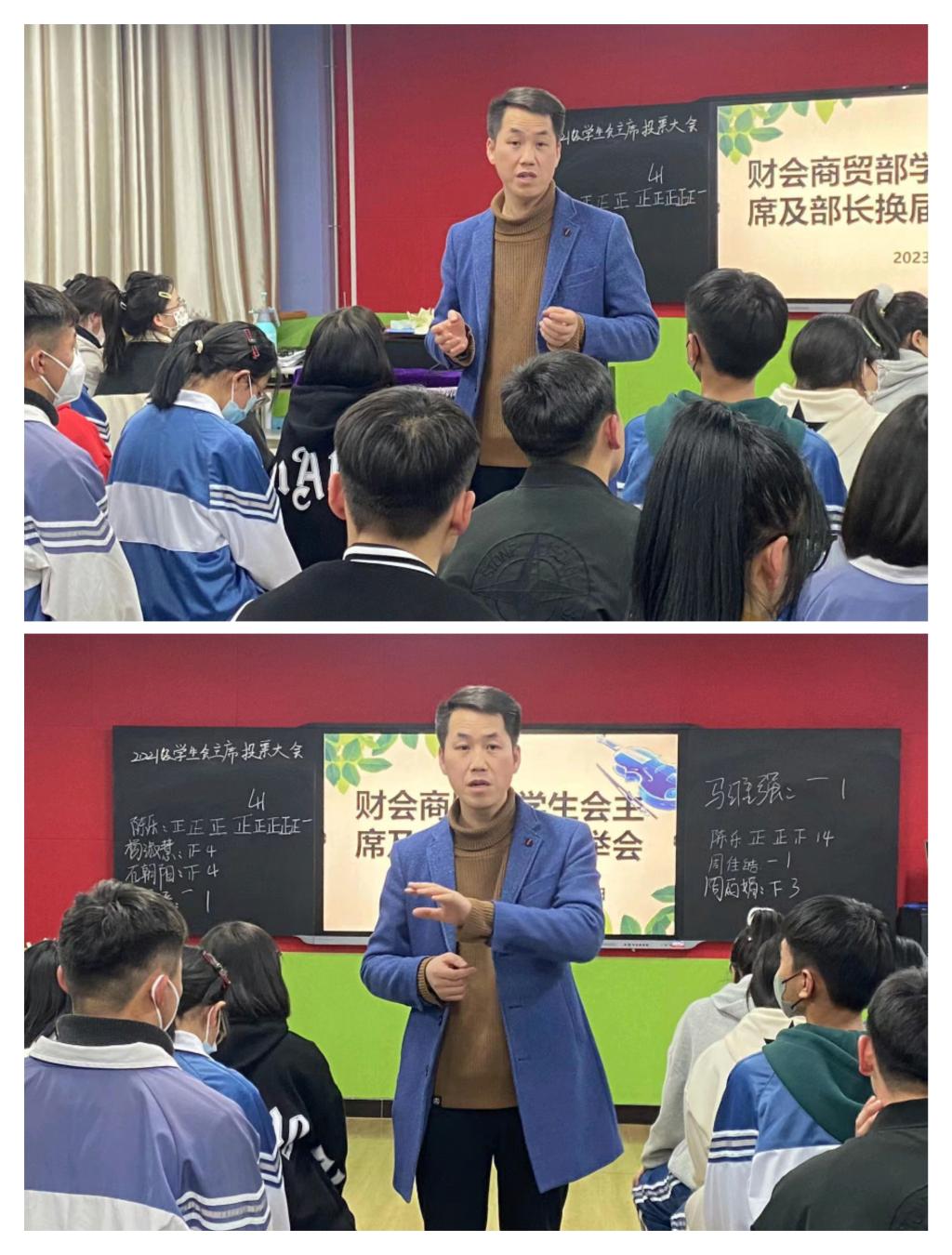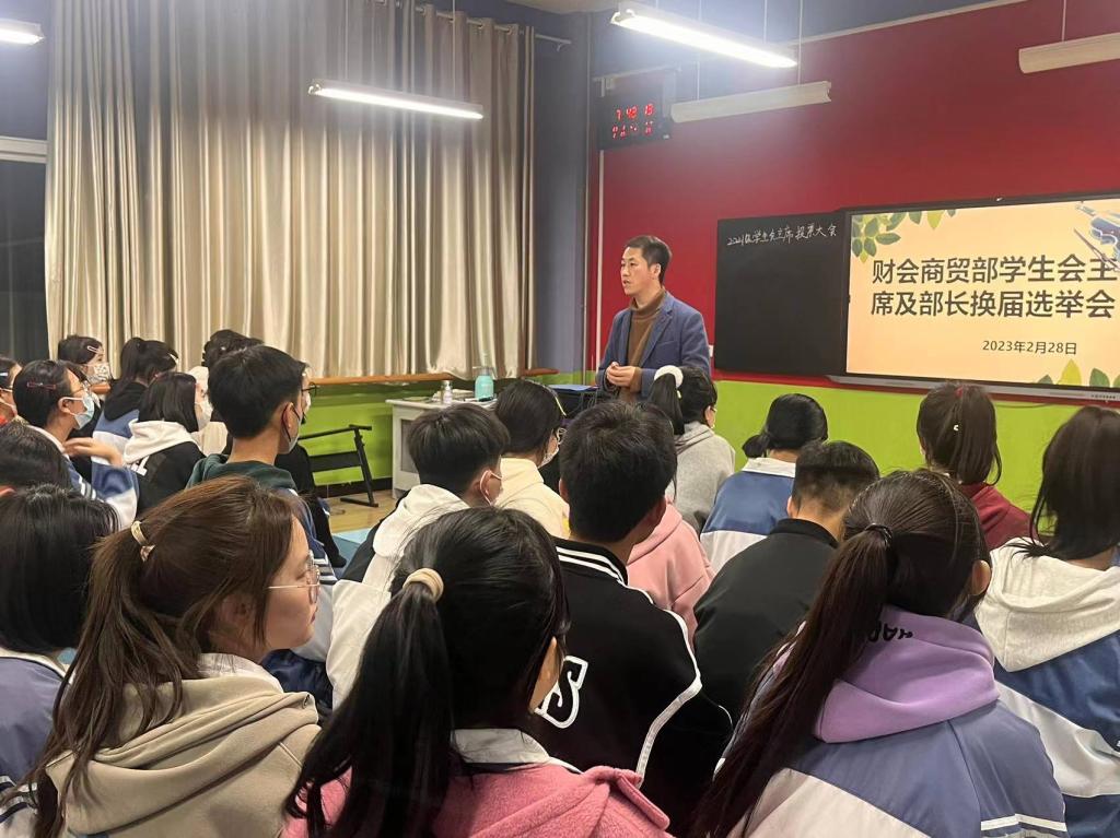 银川职业技术学院财会商贸部学生会换届选举活动,学生会主席、各部门部长以及位学生干部64人参加。会议由何国江老师主持。