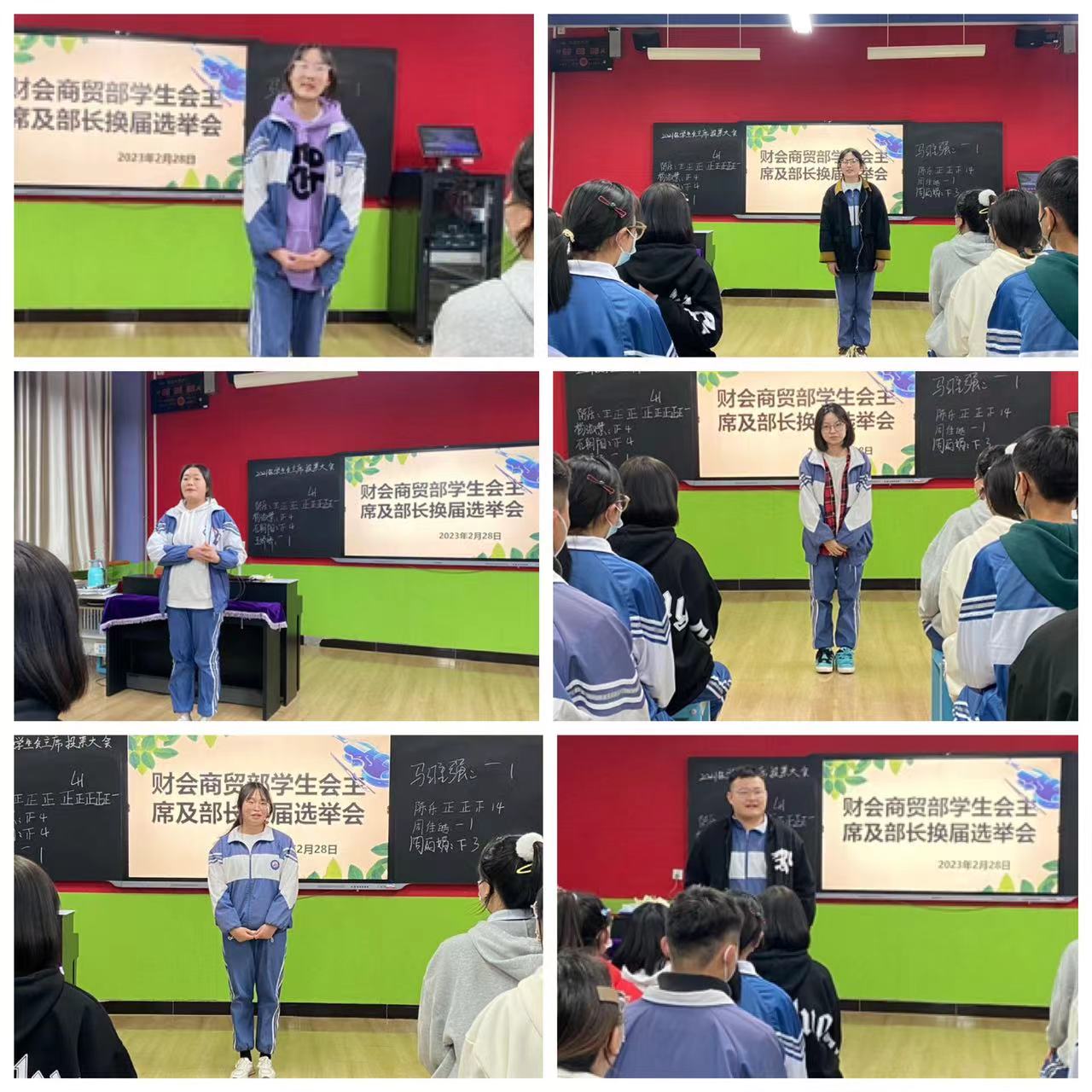 何国江老师宣读了候选人名单、选举办法、拟定的监督、唱票、计票人员以及投票注意事项。随着热烈的掌声,潘涛,陈乐,周丽娟,马绣,王娇娇,杨淑慧,等六位候选人怀着对学生会工作的热情,精心准备,信心十足。他们着装整齐,面带笑容,依次进行竞职唱票。沉着冷静,自信满满,分别从自我介绍、前期工作总结、工作设想、工作展望、预期成果等方面进行了汇报。整个竞选过程中,候选人精彩的表现,赢得大家一致好评。