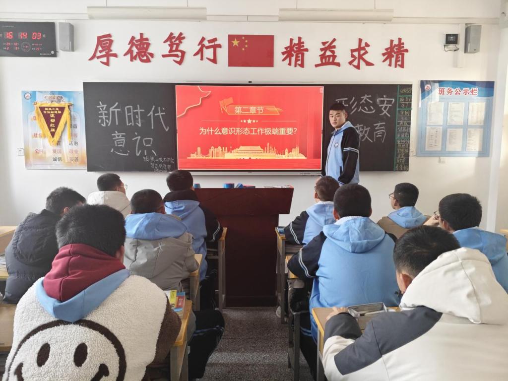 在探讨“为什么意识形态工作极端重要?”时,各班级结合当前国内外形势,深入剖析了意识形态工作面临的复杂环境和严峻挑战。同学们深刻认识到,意识形态工作是党的一项极端重要的工作,关乎国家长治久安和民族凝聚力。因此,加强意识形态安全教育,提高同学们的政治觉悟和鉴别能力,是新时代赋予我们的重要使命。