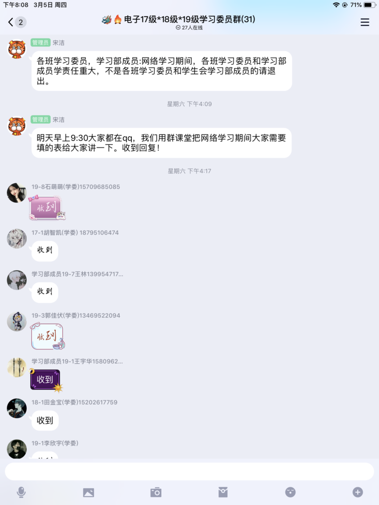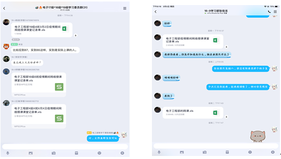 线上教学能否有效开展,培养和加强学生的自我管理是一个重要的难题。怎样使每一个学生都能按照课程和时间的安排进行有效学习,这除了学生提高自我管理意识和能力,家校有效沟通和监督外,发挥学生干部的作用,是系部采取的一个行之有效的措施。3月1日系部主任、教学主任和教学干事组织召开了第一次系部学生会和班级学习委员会,建立学习干部QQ群。对学生干部提要求,教方法,加强跟进,在一周的磨合中学生干部在督促学生学习,加强课堂考核方面发挥了重要的作用,为老师和系部掌握课堂的第一手资料发挥了积极的促进作用,也使学生干部的自我管理能力和水平有了进一步提高。