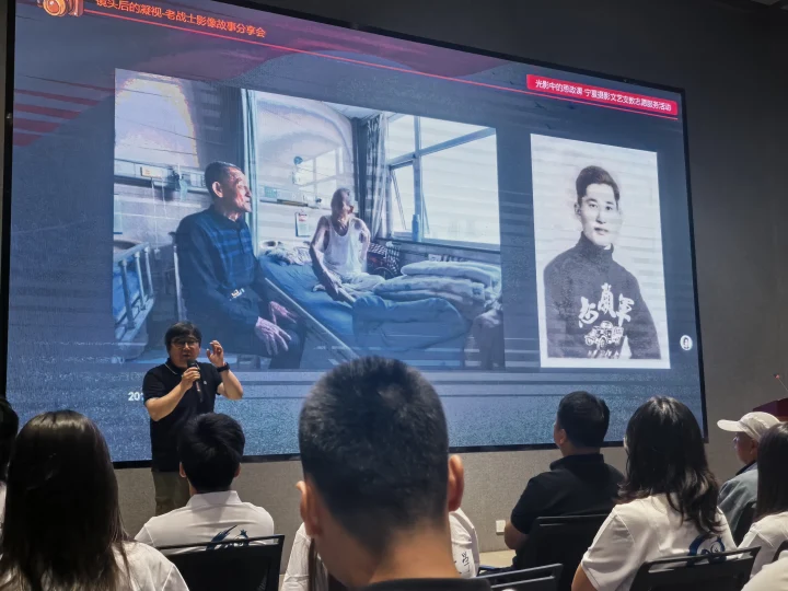 参观结束后,本次影展的主创负责人关海涛老师为党员教师们带来了一场别开生面的专题讲座。关老师以“镜头后的凝视·老战士影像故事分享会”为主题,深入浅出地阐述了老战士精神的时代价值和现实意义。他分享了自己与团队历时五年,深入宁夏各地采访老战士的经历,以及如何通过肖像拍摄、口述历史采集、文献资料与实物结合等方式,为宁夏健在老战士构建起专属的“立体肖像”。