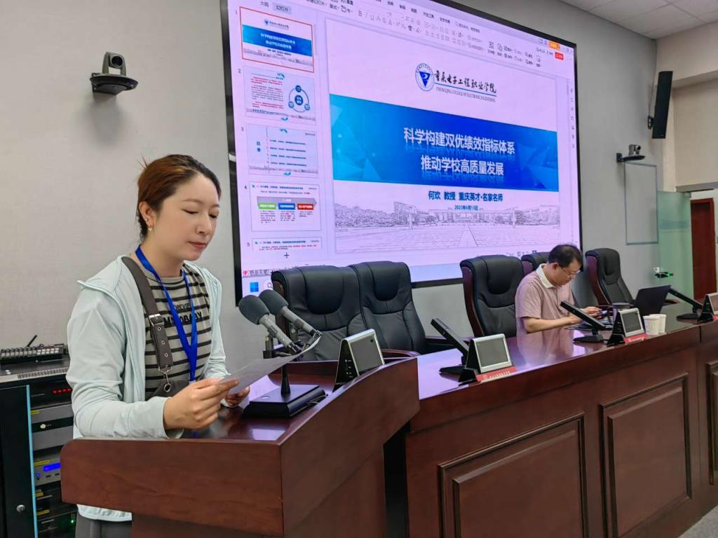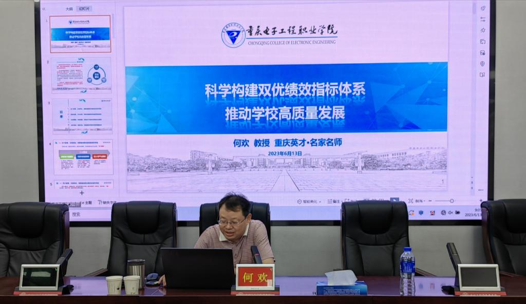 重庆电子工程职业学院何欢教授以《科学构建双优绩效指标体系推动高校高质量发展》为题,从三个兼顾、三维对比,统筹编制保证指标体系科学性、制度引领、平台支撑,数据对接提升项目管理高效性等四个方面,以关注学生的素养和学生专业课知识的学习为重点,深入浅出地讲解了“双能支撑”课程体系建设与“双优”学校建设。呼吁教师要以夯实学生职业技能发展为基础,致力于培养职业知识型、技能型、创新型能工巧匠。