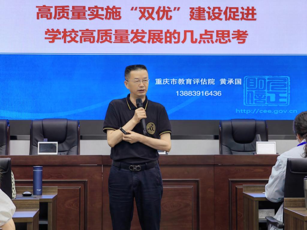 重庆市教育评估院职业与成人教育评估所所长、教师发展评估中心主任、教育部中职教学评估专家组成员黄承国以《高质量实施“双优”建设促进学校高质量发展的几点思考》为题,以现代职业教育高质量发展为重点,用诙谐幽默的语言深入解读类型教育的特征、行为样态等,使老师们明白培养学生不能只注重技能培养,素质的培养才是现代职业教育高质量发展的必要条件。