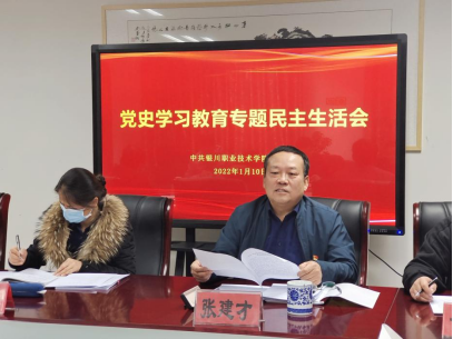 2022年1月10日上午,银川职业技术学院党委召开了党史学习教育专题民主生活会。市委党史学习教育第三巡回指导组、市教育工委、市纪委监委派驻第十纪检监察组领导莅临督导,会议由学院党委委员、副院长张建才主持,学院全体领导班子成员参加。