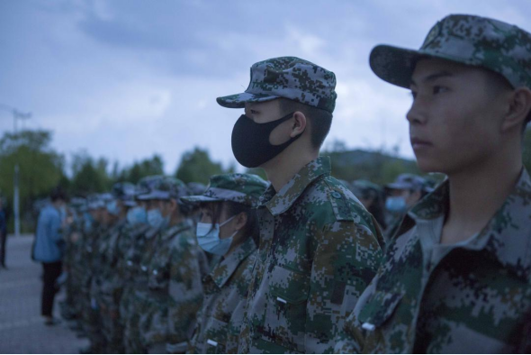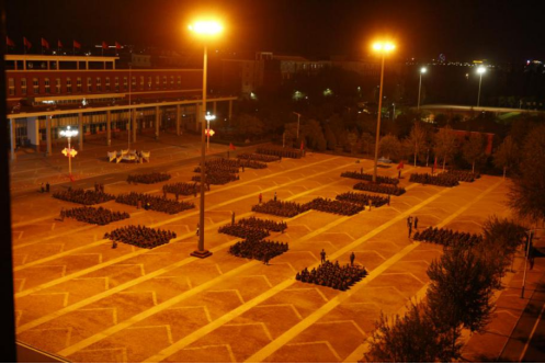 9月14日下午七点,第一批报到新生在学院俭德广场集结。同学们身着迷彩服整齐列队。