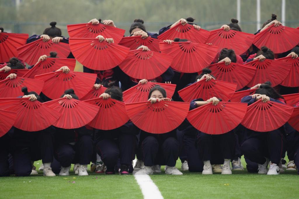 智能制造部《扇鼓合韵》表演方队,整齐划一,气势磅礴。