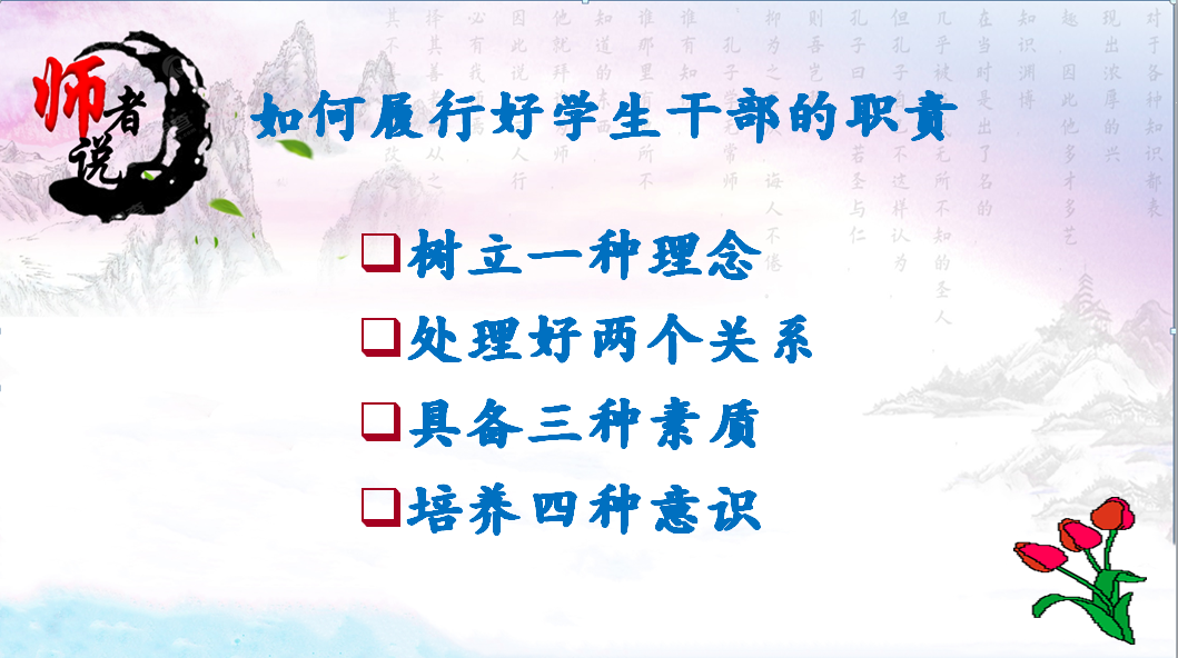 张副院长以严谨求实的态度,亲切关怀的语气,通俗易懂的方式,悉心为学生干部指导工作,解开困惑。他围绕如何成为一名优秀的学生干部,通过学生干部的角色和定位、如何履行学生干部的职责两个方面展开培训,启示学生干部们要明确定位,强调学生干部首先是学生,学生的首要任务是学习,要处理好学习与工作的关系。其次从“服务学生、提高自己、奉献学校”的目标出发,深入浅出地讲解了成为优秀学生干部的途径。提到学生干部应树立好一个理念——全面发展的理念;处理好两个关系——学习与工作的关系;具备好三种素质——政治素质、能力素质、团队素质;培养好四种意识——服务意识,责任意识,参与意识,开拓意识。并结合党史教育,寄语学生干部们要坚定信念,完善好自己的同时去服务他人,从而不断加速自己的成长。