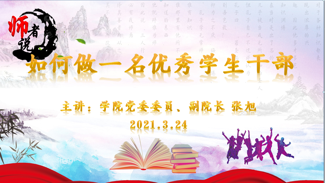 团校培训班讲座第二讲如期而至。 2021年3月24日下午三点,学院党委委员、副院长张旭以《如何做一个优秀的学生干部》为主题开展讲座。各专业部团总支书记、团学干部、优秀团员和入团积极分子等500余人参加了培训学习,学院团委丁媛副书记担任主持。