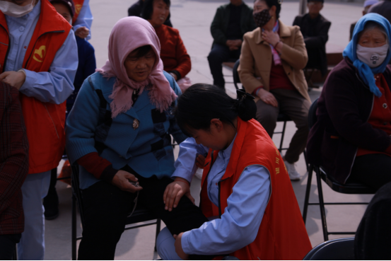 与此同时,护理康养部的学生们也在社区活动中心忙碌着。他们热情地邀请老人们坐下,为他们测量血压、按摩肩颈。学生们耐心细致地询问老人们的身体状况,根据测量结果和老人的反馈,有针对性地开展健康宣传讲解。