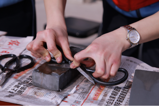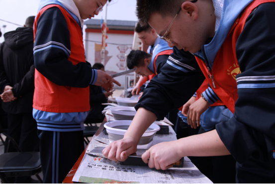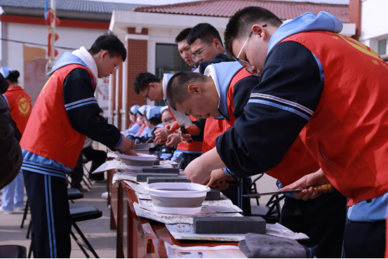 下午2点20分,志愿者们抵达同阳新村。餐旅服务部的学生们迅速搭建起磨刀磨剪子的工作台。他们铺好抹布,拿起磨刀石,专注地打磨每一把刀具和剪刀。尽管天气微凉,但学生们热情不减,阳光下,他们额前闪烁的汗珠与身上的志愿者徽章交相辉映。