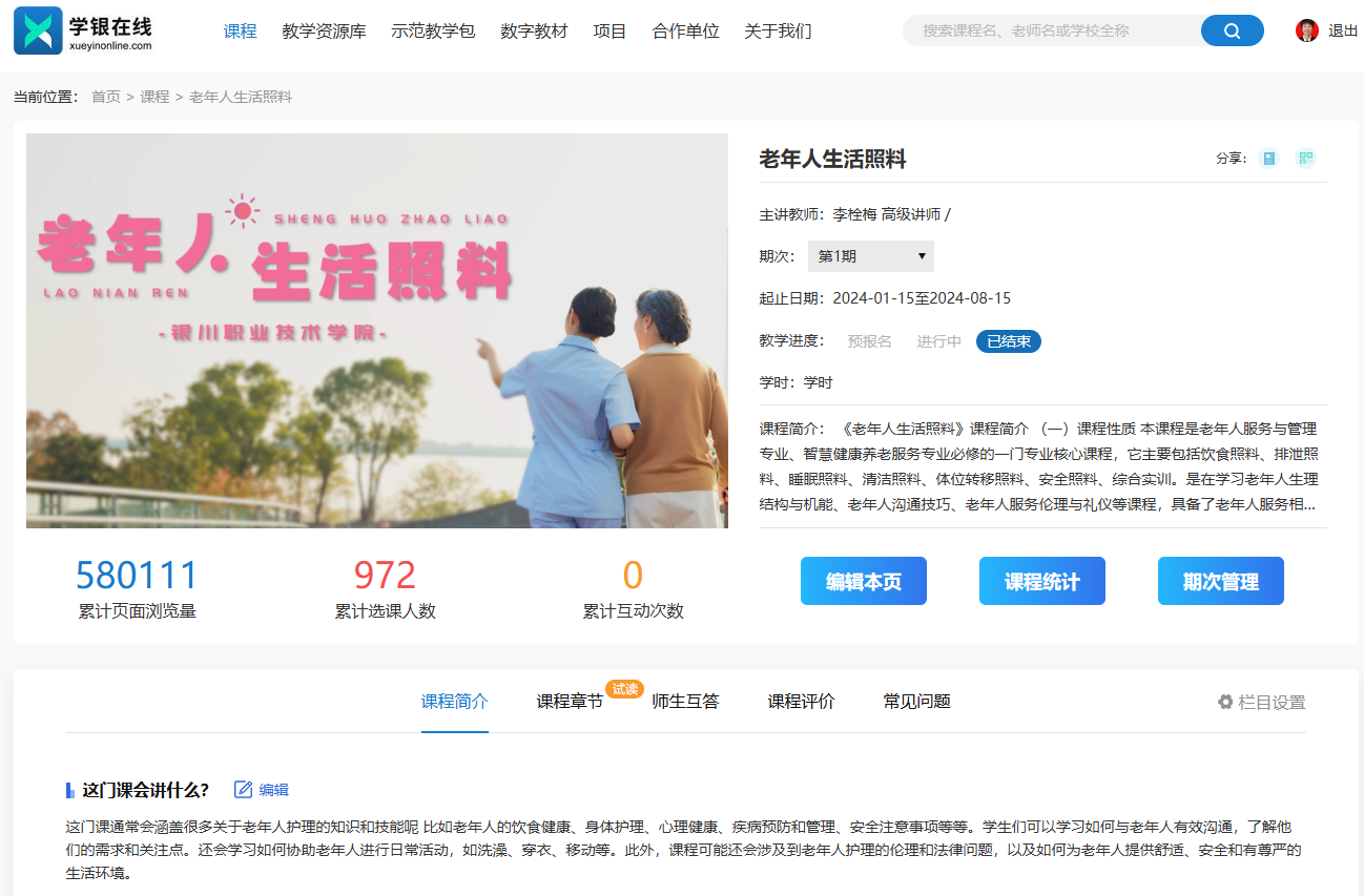 精品课程助力线上教学 在学院课程教学处和王燕丽职业教育学科名师工作室的指导引领下,建设《老年人生活照料》精品课,截止目前,学银在线教学平台累计选课972人次,浏览量580111次。学生可随时随地,不受时空限制,解决学习中的疑难困惑,效果显著。
