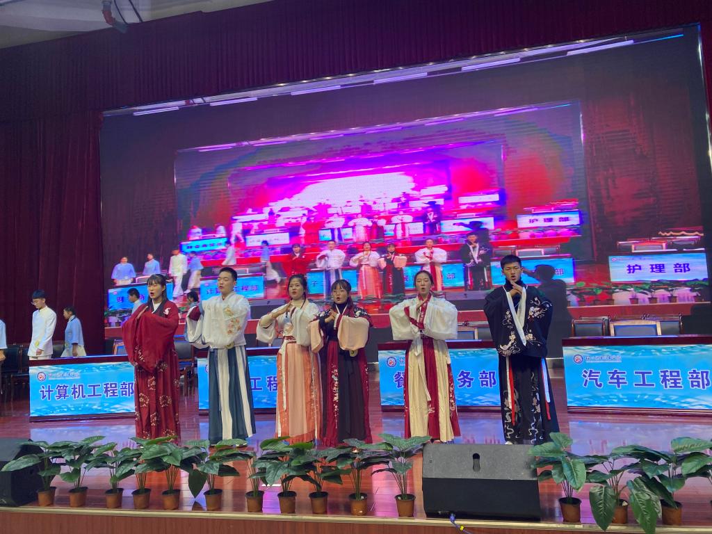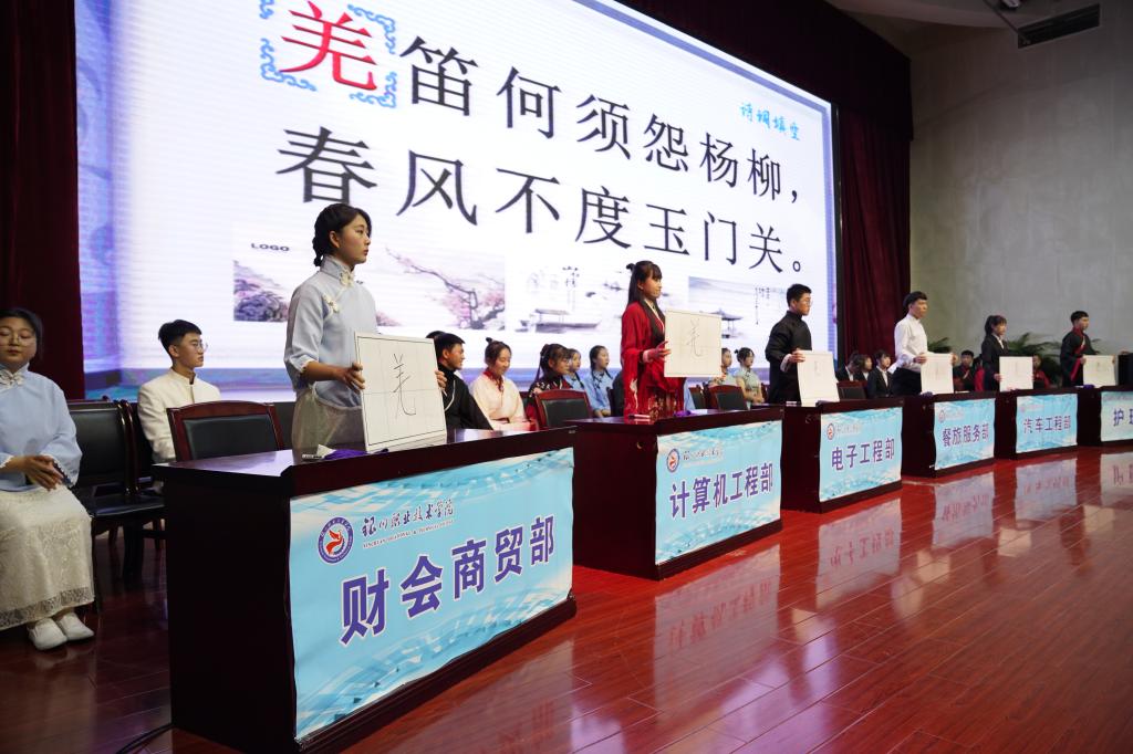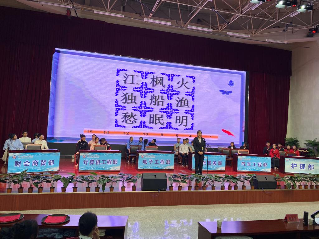 比赛开始前,开场短片缓缓流出浓郁的诗词学习氛围,各专业部语文教师犹如八仙过海,以不同方式带着参赛选手或诗或舞,尽情展示着中华诗词的魅力。胡蔚菁老师对苏轼《定风波》一词豪放洒脱的诵读,道尽了我们中华诗词内涵的博大精深。气质如兰、一颦一笑犹如古代穿越而来的主持人朱瑛老师,口吐莲花,题词流畅,一句句诗词如同清风拂过山岚,白云流过天际,更是让我们感受了腹有诗书气自华的自信与美好。
