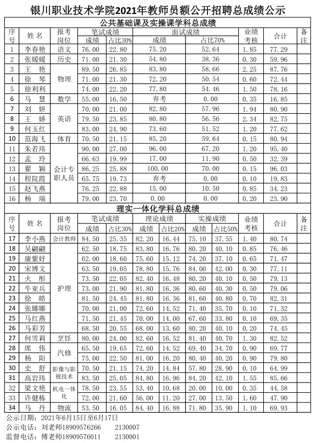 银川职业技术学院2021年教师员额公开招聘总成绩公示