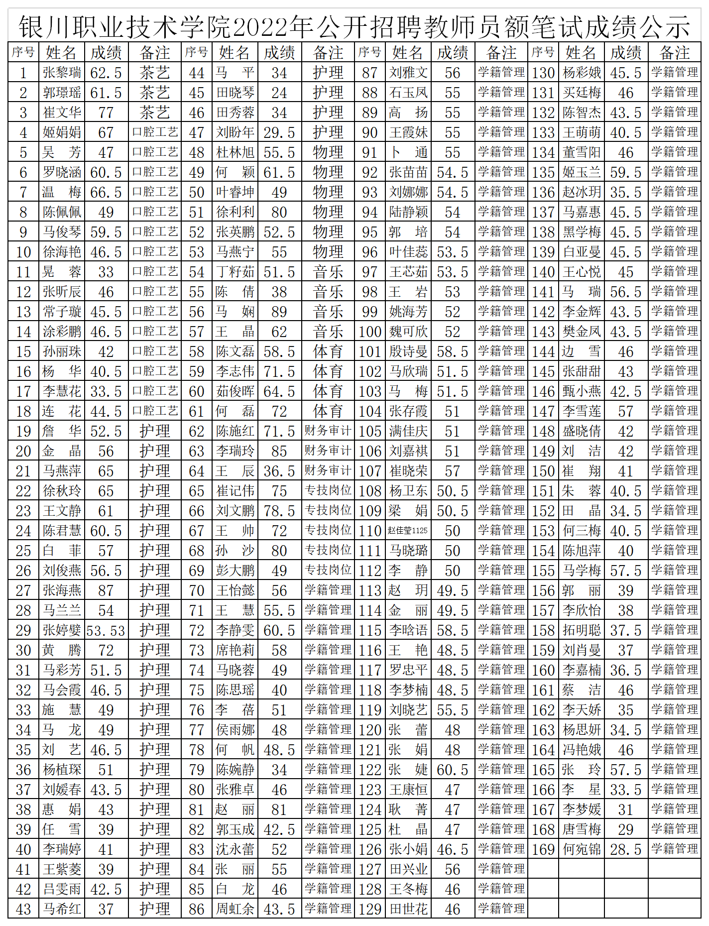 现将银川职业技术学院2022年公开招聘教师员额笔试成绩予以公示。