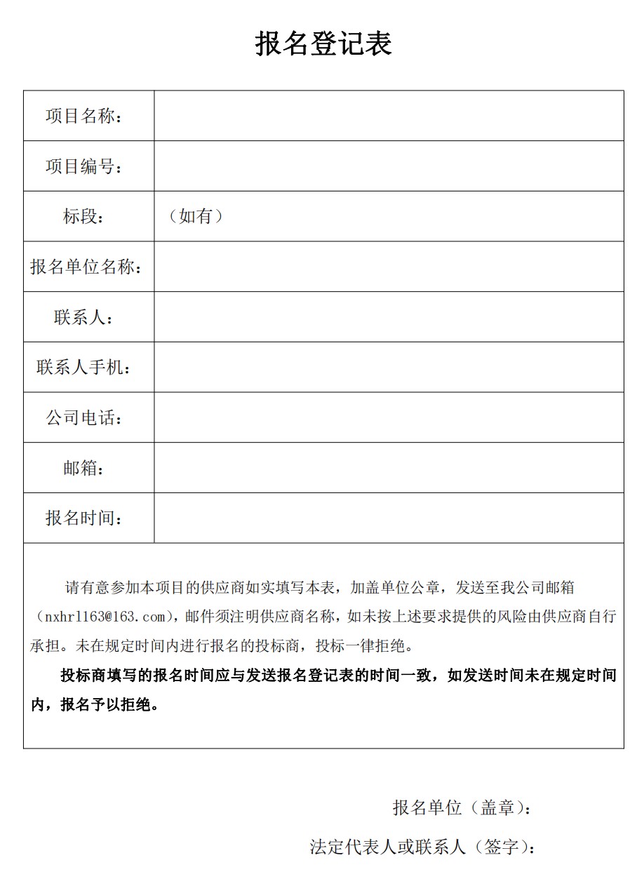 2.1 有意投标的供应商须填写本公告附件中的报名登记表,后将盖章的登记表以PDF格式发送至宁夏鸿瑞隆招标有限公司邮箱(nxhrl163@163.com)进行报名,邮件内容里注明参与的项目名称及相关有效信息,对逾期递交报名资料的,将不予受理。投标商所提供的资料和数据必须是真实有效的。报名成功后发送电子版磋商文件。