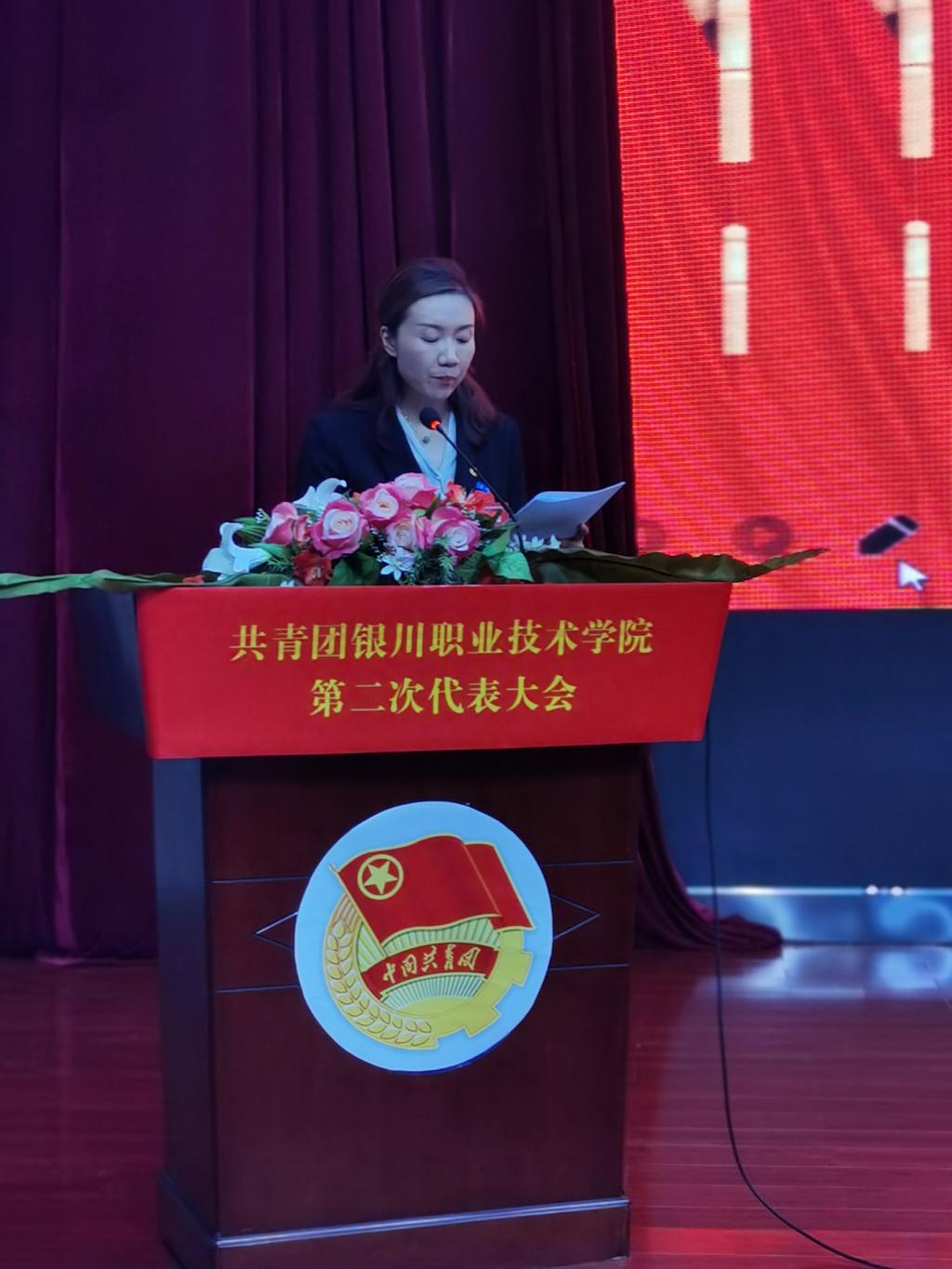 随后,丁媛同志代表第一届委员会作《坚定信念,凝聚力量,开拓进取,用实干和担当谱写银川职业技术学院共青团工作新篇章》工作报告,报告从“回顾过去—奋斗擦亮青春底色”和“展望未来—整装待发再谱新篇”两个方面,用大量的数据、详实的资料和精心的谋划充分展现了过去几年学院共青团工作所取得的成就和今后学院共青团努力的方向。报告号召站在“两个一百年”的历史交汇点,学院各级团组织和广大共青团员要更加紧密地团结在以习近平同志为核心的党中央周围,在院党委和上级团组织的正确领导下,以咬钉嚼铁的干劲、只争朝夕的拼劲、不负韶华的闯劲带头刻苦学习、带头苦干实干、带头严格自律,为学院创建“双优校”、加快高质量发展作出新的更大的贡献。