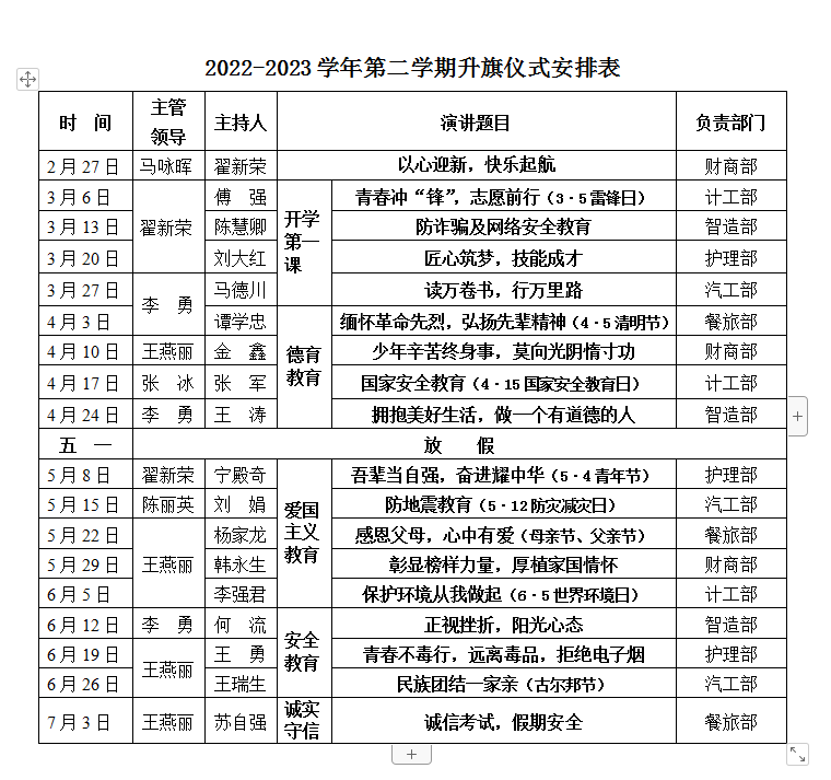 为加强学生社会责任和集体荣誉感,深化升旗仪式的理想信念和爱国主义教育作用,展现我院学生昂扬向上的精神面貌,现将本学期升旗仪式做如下安排,请各处室、各专业部提早准备,确保工作顺利开展。