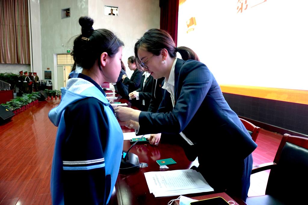 老团员为新团员佩戴团员徽章,颁发团章、团员证。团员徽章在胸前闪耀,新征程的号角已然吹响。从佩戴上团员徽章的这一刻起,他们定将努力履行团员的责任与义务,为青春的理想而奋斗,为中华民族的复兴而奋斗。