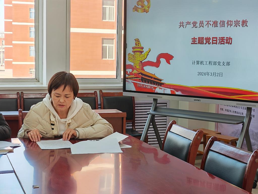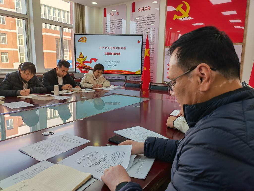 为切实增强支部党员的政治责任感,进一步提升党员思想认识,坚定理想信念,永葆共产党人的本色,计算机工程部党支部按照学院党委《关于组织开展2024年2月主题党日活动的通知》的精神和工作要求于2024年3月2日在支部党员活动室开展了,党支部开展了“共产党员不准信仰宗教”主题党日活动。