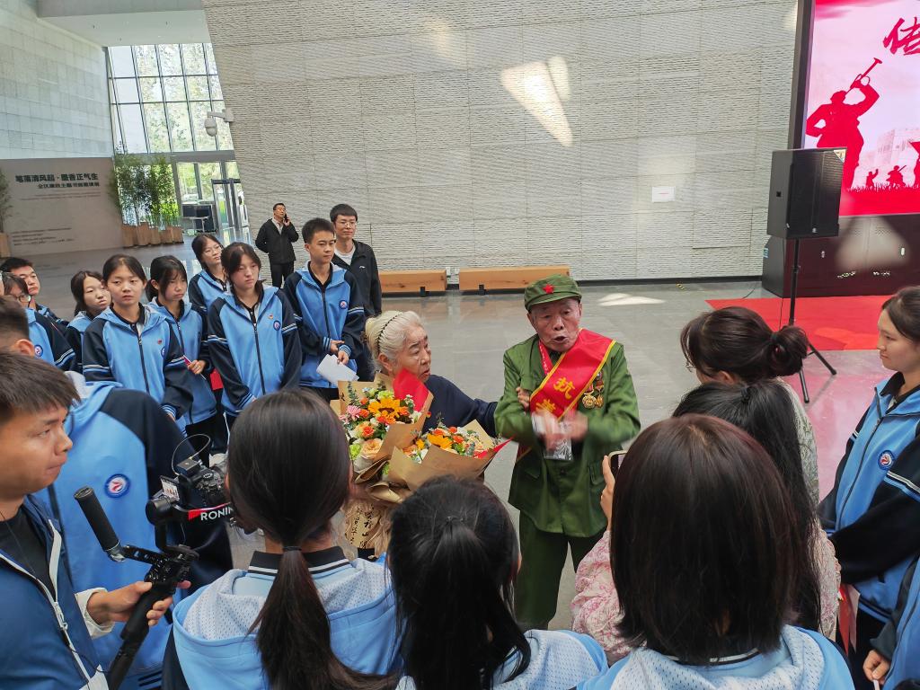 90多岁高龄的两名抗战老战士代表黄延海、李文祥缓缓进场,现场响起经久不息的掌声学生代表手捧鲜花,向老战士敬献鲜花,稚嫩的脸庞与饱经风霜的面容交相辉映。老战士忆战火岁月、赞今日小康,哽咽寄语:“没有共产党就没有今天的幸福生活,永远跟党走!”
