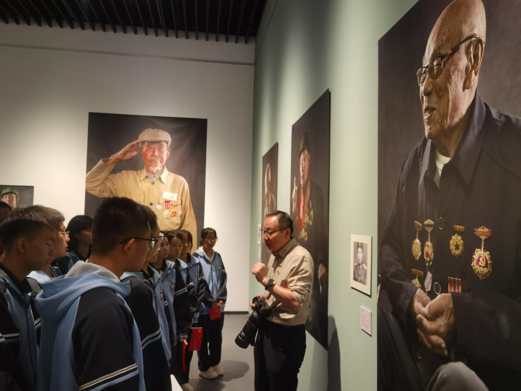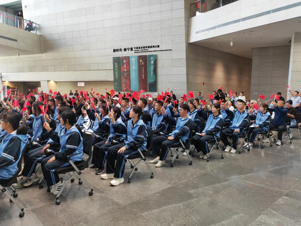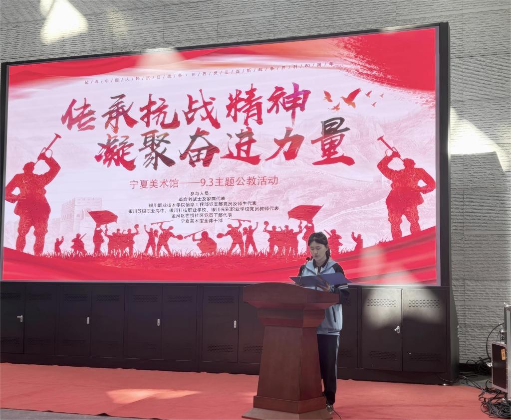 9月3日清晨,由银川职业技术学院信息工程部党支部联合夏美术馆党支部组织宁夏光彩职业学校、银川科技职业学校、银川苏银职业高中党员教师代表、银川市金凤区世悦社区党员干部代表、宁夏美术馆全体干部与抗战老战士代表300余名在宁夏美术馆开展“传承抗战精神 凝聚奋进力量”主题党日活动共同纪念中国人民抗日战争暨世界反法西斯战争胜利80周年,在沉浸式的红色课堂中感悟初心、汲取力量。