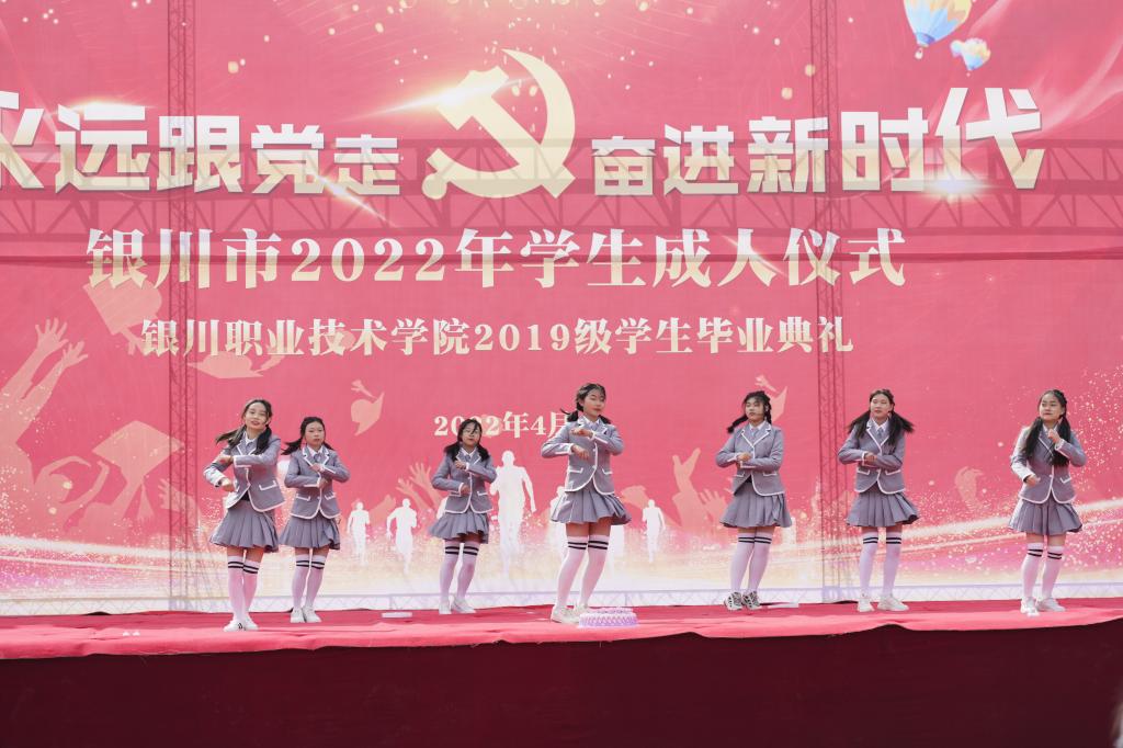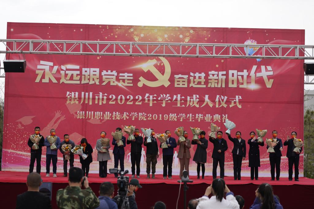 2022年4月14日下午15时,银川职业技术学院隆重举行“永远跟党走•奋进新时代”银川市2022年学生成人仪式银川职业技术学院2019级学生毕业典礼。2019级全体学生、班主任齐聚俭德广场,在学院领导和班主任的见证下,庄严宣告跨入成年人行列。出席本次活动的有学院领导班子成员、各处室、各专业部的主任们。学院党委书记、院长马咏晖饱含深情地表达了对毕业生衷心、美好的祝愿,她依依不舍的回忆了孩子在校三年的美好学习生活,语重心长告诉学生们成人的意义是责任、担当。成长的过程就是不断地追问、不断地解决问题、在不断地完善问题之后不断的成长。成长,既是奋进,也是见证。最后,马院长给所有即将毕业的同学们提出三点希望:一、涵养爱党、爱国情怀,勇担时代大任。新时代青年4要努力树立符合新时代发展潮流的人生价值观,踏实修好公德、学会感恩、学会宽容、学会自律,扣好人生第一粒扣子,做有益于祖国、有益于人民的人。二、永葆“求知者”的姿态,勇做时代发展的弄潮儿。要练就过硬本领,在实践中经受锻炼,“在斗争中经风雨、见世面、壮筋骨、长才干”,成为民族“复兴号”扬帆起航的不竭动力。三、担负历史使命,不负青春勇毅前行。从历史脉络中定位自身与当下,克服焦虑和躁气,不断修炼格局、坚定自我认知,收获知识、掌握才干,有对未来规划和选择的能力。